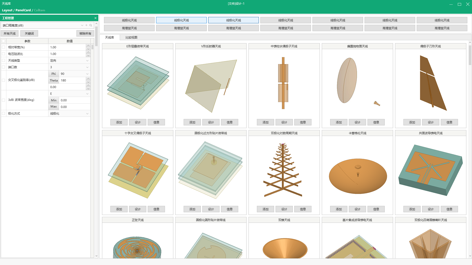 具备天线单元的快速选型能力,涵盖多种天线形式。用户可以根据目标性能要求,选择合适的天线形式,从而完成天线的粗设计。支持预估天线的驻波比、轴比、增益、方向图等技术指标,并直接生成结构模型进行后续仿真计算。